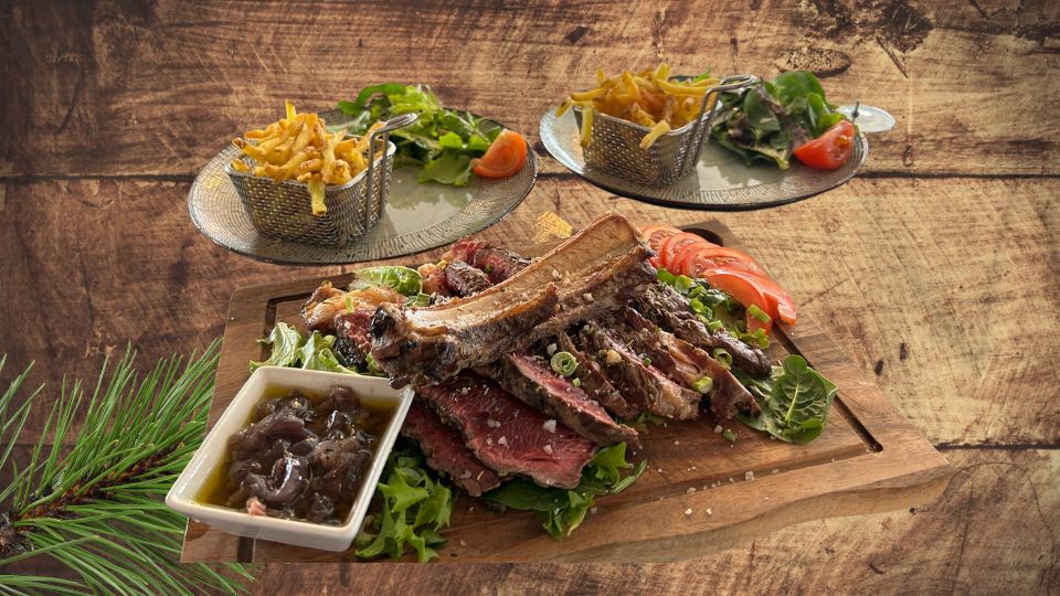 | En accompagnement : Les viandes sont servies avec des frites fraîches et de la salade fraiche. Sauce poivre, roquefort ou échalotes confites. | |